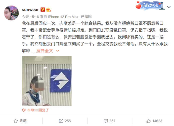 10月17日,@sunwear 连续两次长文回击该网友:态度差是一个综合结果。我从没有拒绝戴口罩不愿意戴口罩,我非常配合尊重疫情防控规定。