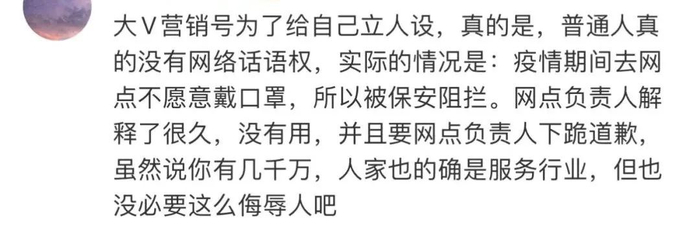 “到门口发现没戴口罩,保安指了指嘴,我说忘带了,保安扭着脑袋抬手轰我出去。我问哪有卖的,还是一摆手。我立刻出去门口隔壁立刻买了一个。全程交流我说三句话。没有人什么跟我解释半天我让人下跪的情节,全程10-15秒就结束了。我非常配合买完口罩再进去。从我之前发的图片里你们也看到了,他们自己员工口罩挂在下巴上,对内不戴口罩,对外重拳出击。”