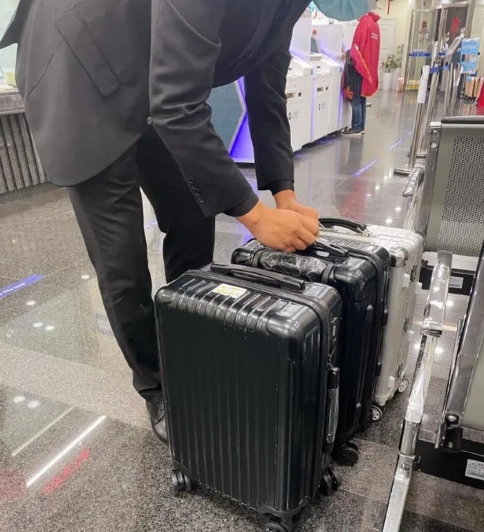 博主晒出的另一张照片中,有人将几只行李箱搬到一辆劳斯莱斯的后备箱中。