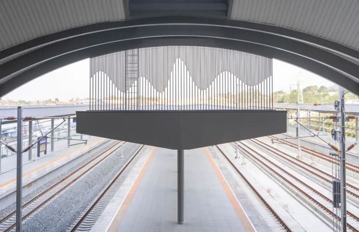 进站雨棚部分体现了安庆地区山水秀丽,生态良好的特点。山水屏风与站房外的山体遥相呼应,一虚一实,十分应景。山墙的造型细节上体现了徽派建筑特征。