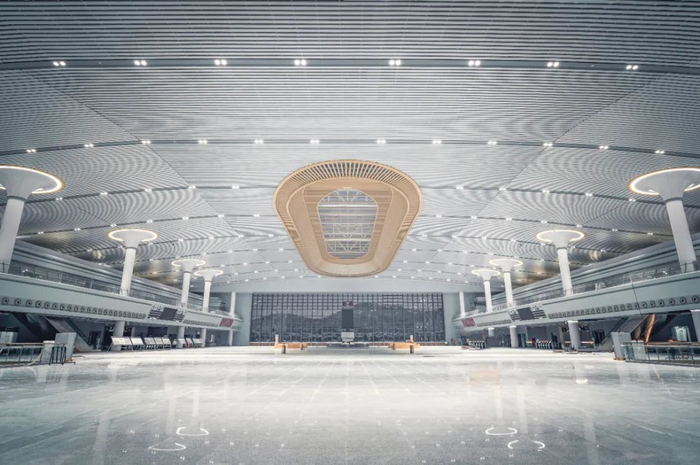 进站厅中央区域做简约“藻井”造型,使得中央区域高耸挺拔,辅以柔和灯光显得富有层次且尊贵高雅。藻井顶板点缀望江挑花,采用安庆地域经典文化贯穿站房整体空间,打造文化、内涵、统一和谐的公共空间。