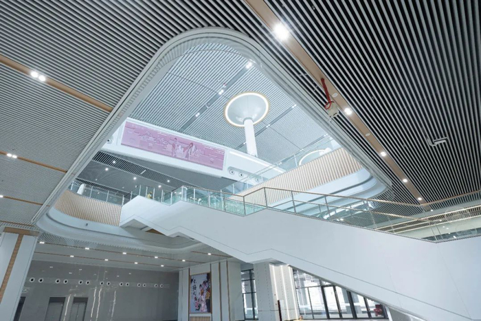 进站厅临空面采用波纹铝板,纹理从抽象的皖江之水的波纹衍生而来,同时也体现了黄梅戏的扇子造型,主乘电梯如方舟起航,寓意安庆的发展与美好未来。