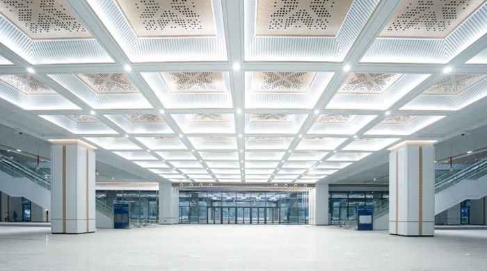 候车大厅的船型天花造型是整个空间的重点打造区域,为了达到天窗和周边条板吊顶光影变换的最佳效果,前期打印时制作了三种不同的冲孔图案间距,经过多轮比对,最终确定了最佳的比例关系。