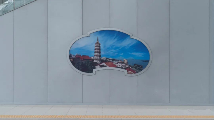 站台楼梯侧面的窗景造型灯箱,灵感来源于徽派建筑的围墙透景,丰富了立面造型。楼梯被塑造成地方文化展示的空间。