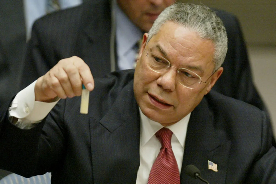 2003年2月5日,时任美国国务卿鲍威尔在联合国安理会上拿出一管“不明物质”作为“证据”,指责伊拉克的“生化武器”能造成“巨大杀伤”。俄罗斯总统普京曾调侃说:“2003年,鲍威尔摇晃着一小瓶不明物质,说那是大规模杀伤性武器的证据,里面搞不好是洗衣粉。”