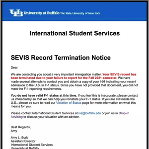 还有部分学生反映称,自己的学校邮箱(UB mail)没有收到提交I-94的提醒,只有“身份终止”的邮件,且有些提醒邮件被发送到了学生早期注册美国签证时所使用的备用邮箱中,导致学生没有及时查看,错过提交期限。