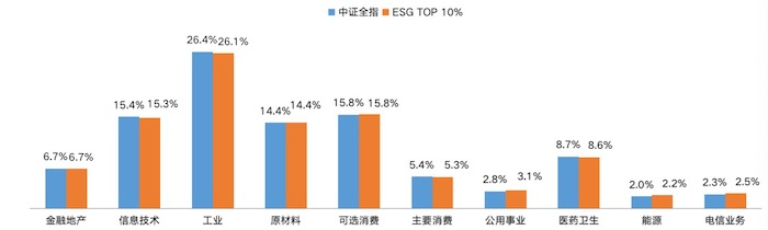 目前的数据显示,中证全指样本中ESG评分最高的100家上市公司行业分布与中证全指行业分布基本一致,并未出现ESG评分高的公司聚集在某几个特定行业的情况。同时,由于不同行业ESG管理存在明显差异,因此中证ESG评价采用行业中性方式构建,评价不存在明显行业倾向。