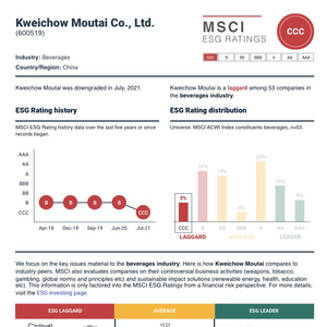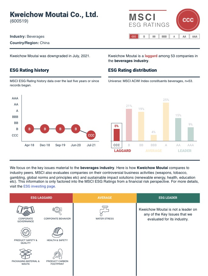 贵州茅台本周一度大跌超6%,而这恰逢MSCI近期下调茅台ESG(环境、社会、治理)评级至CCC级(此前为B级),导致其成为全球20大市值公司中获得最低MSCI ESG评级的企业。
