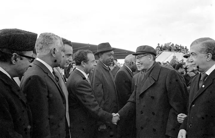 1971年11月11日,以外交部副部长乔冠华为团长、黄华为副团长的中华人民共和国代表团抵达纽约。图为乔冠华团长抵达纽约后,在机场和友好国家的代表们握手。新华社发