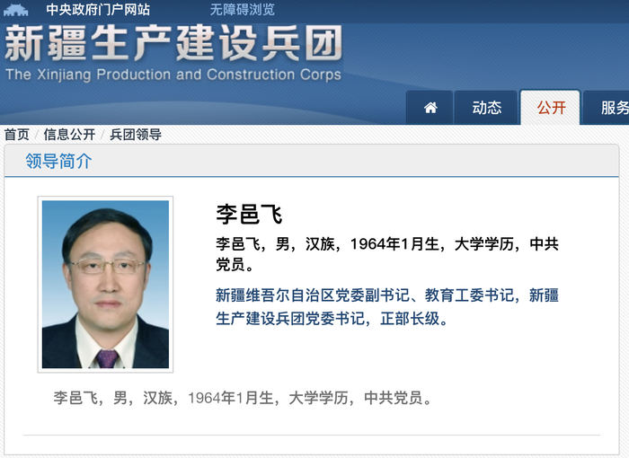 新疆生产建设兵团官网“兵团领导”一栏近日更新显示,刚获任新疆生产建设兵团党委书记职务的李邑飞已明确为正部长级干部。