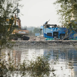 越过围挡,本刊记者步行了接近3分钟才抵达涉事大巴附近。远处大货车的燃油味和河水的味道一同扑在人脸上。远远向南望去,便道最低处仍浸在水下,经午后阳光折射,好像一块巨大的反光玻璃。