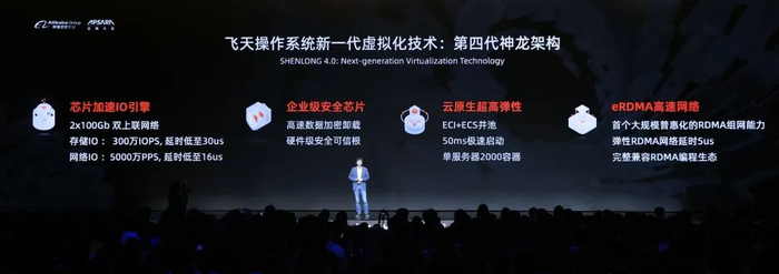 阿里云基于飞天向下定义硬件的同时,在基础软件层面也持续升级迭代。2021云栖大会上,阿里云正式推出第四代神龙架构。