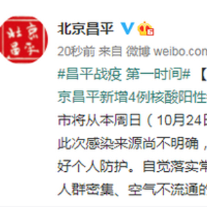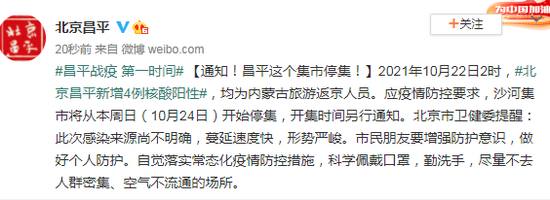 2021年10月22日2时,#北京昌平新增4例核酸阳性#,均为内蒙古旅游返京人员。应疫情防控要求,沙河集市将从本周日(10月24日)开始停集,开集时间另行通知。北京市卫健委提醒:此次感染来源尚不明确,蔓延速度快,形势严峻。市民朋友要增强防护意识,做好个人防护。自觉落实常态化疫情防控措施,科学佩戴口罩,勤洗手,尽量不去人群密集、空气不流通的场所。