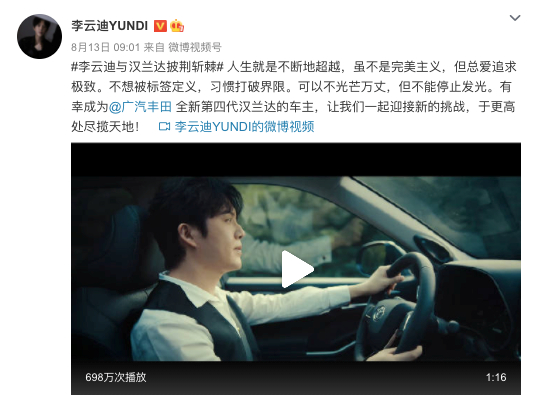 8月13日,李云迪微博显示,其成为广汽丰田汉兰达代言人。截至目前,“李云迪与汉兰达披荆斩棘”的话题有2.9亿的阅读量及2.2万次网友讨论,代言视频也有超过700万次播放。针对李云迪代言广汽丰田一事,10月22日,广汽丰田官方表示,李云迪先生并非广汽丰田代言人,也不是全新第四代汉兰达代言人。他仅作为汉兰达发布会项目中的演出嘉宾,在8月份出席项目现场,目前双方已无相关合作。