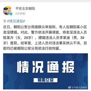 10月21日晚,@平安北京朝阳 发布一则通报称,近日朝阳公安分局接群众举报,有人在朝阳某小区卖淫嫖娼。对此,警方依法开展调查,将卖淫违法人员陈某卉(女,29岁),嫖娼违法人员李某迪(男,39岁)查获。经审查,上述人员对违法事实供认不讳,目前均已被朝阳公安分局依法行政拘留。
