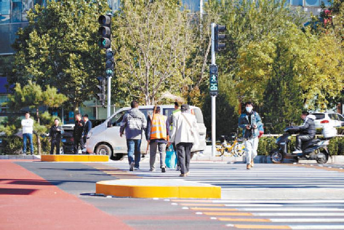 “以前,行人过人行道要走65米。老人往往还没走到地儿,灯就变红了。”朝阳区交通委规划科科长马卫国说的这个路口,就是望京西路和阜通西大街的交叉口,呈“Y”字形,是朝阳区最大的路口。最近,该路口通过精细改造,路口面积缩小,行人过街距离缩短约30%。