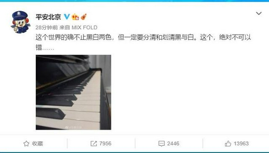 九派新闻注意到,通报发布前近半小时,平安北京发文:这个世界的确不止黑白两色,但一定要分清和划清黑与白。这个,绝对不可以错…… 疑似暗指李云迪嫖娼一事。