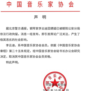 原标题:中国音乐家协会发布声明:取消李云迪会员资格