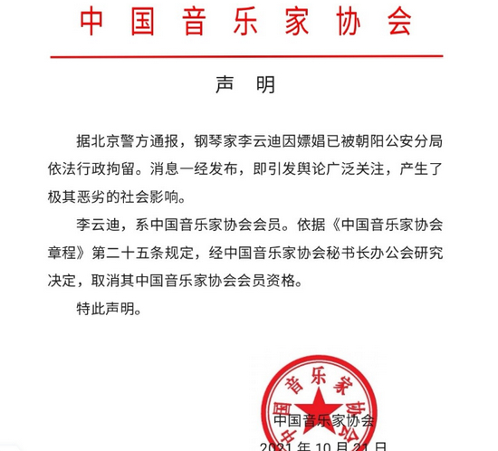 中国音乐家协会网站发布声明,据北京警方通报,钢琴家李云迪因嫖娼已被朝阳公安分局依法行政拘留。经中国音乐家协会秘书长办公会研究决定,取消其中国音乐家协会会员资格。