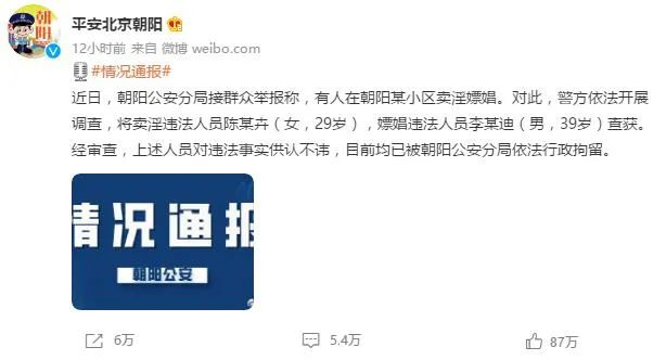 21日晚,平安朝阳针对李云迪嫖娼事件进行通报:近日,朝阳公安分局接群众举报称,有人在朝阳某小区卖淫嫖娼。对此,警方将卖淫违法人员陈某卉,嫖娼违法人员李某迪查获。经审查,上述人员对违法事实供认不讳,目前均已被朝阳公安分局依法行政拘留。