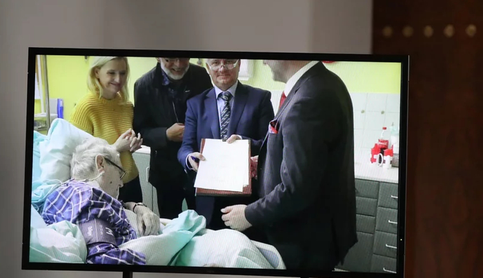 画面显示,众议院议长拉德克·冯德拉切克一行与泽曼在病房内会面。泽曼侧卧病床,在众人注视下签署法令召开新议会。现场无人佩戴口罩。