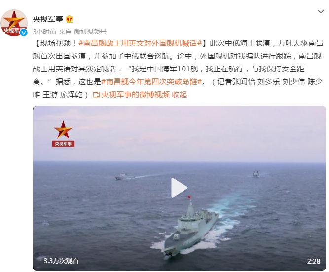 此次中俄海上联演,万吨大驱南昌舰首次出国参演,并参加了中俄联合巡航。途中,外国舰机对我编队进行跟踪,南昌舰战士用英语对其淡定喊话:“我是中国海军101舰,我正在航行,与我保持安全距离。”据悉,这也是#南昌舰今年第四次突破岛链#。(记者张闻怡 刘多乐 刘少伟 陈少唯 王游 庞泽乾)