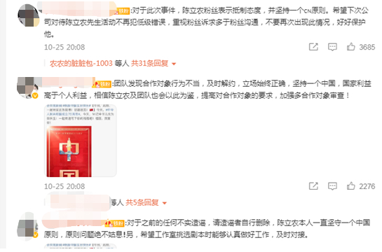 还有网友表示:相关娱乐公司工作疏忽没有事先做好合作方背景调查,负有不可推卸的责任,表示深刻反省并向广大网友与粉丝表示道歉。陈立农及团队立场始终正确,坚持一个中国,国家利益高于个人利益。愿意接受广大网友的监督,一起维护一个中国的原则坚决不容动摇!