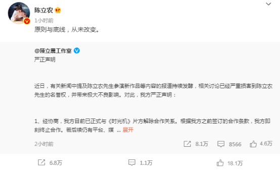 事件发酵后,陈立农的微博也传发了其官方工作室发布的声明,并发文称,“原剧与底线,从未改变。”