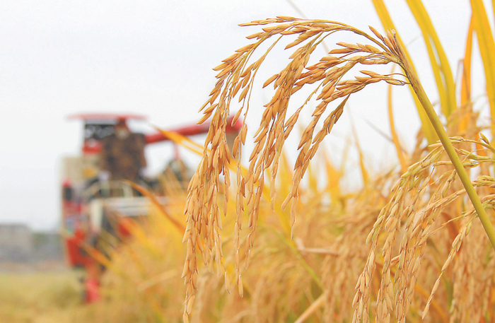 10月19日,濉溪县五沟镇北湖南村恒丰水稻种植基地,金灿灿的新型优质水稻喜获丰收。该基地是在复垦塌陷地上建起的,现为淮北市高标准农田建设面积最大的水稻种植基地,今年亩产600多公斤。本报通讯员周方玲摄