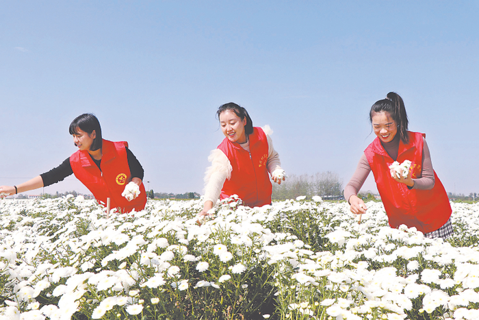 10月12日,亳州市谯城区罗庄的亳菊种植基地,志愿者正在帮助农民采摘成熟的亳菊花。本报通讯员武清海摄10月12日,亳州市谯城区罗庄的亳菊种植基地,志愿者正在帮助农民采摘成熟的亳菊花。本报通讯员武清海摄