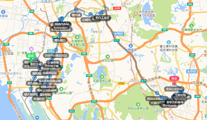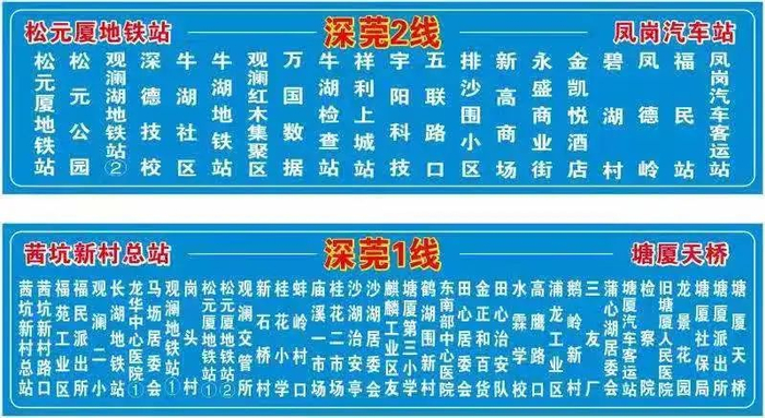 龙华公交总站、玉翠市场、龙华汽车站、竹村地铁站、茜坑地铁站、观澜二小、龙华中心医院①、马坜居委会、观澜地铁站①、岗头村、松元厦地铁站①、观澜交管所、新石桥村、蚌岭村口、庙溪一市场、桂花二市场、沙湖治安亭、沙湖村委会、塘厦第三小学、鹤湖围新村、东南部中心医院、田心居委会、金正和百货、田心治安队、水霖学校、浦龙新村、溪头旧村、鹅岭新村、三友厂、莆心湖居委会、塘厦汽车客运站、旧塘厦人民医院、龙景花园、塘厦社保局、塘厦派出所、塘厦天桥