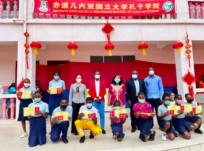 仪式前,赤几国立大学孔子学院和多语种学校部分学生展示了武术、书法、乐器表演等中国特色文化才艺。(来源:驻赤道几内亚使馆)