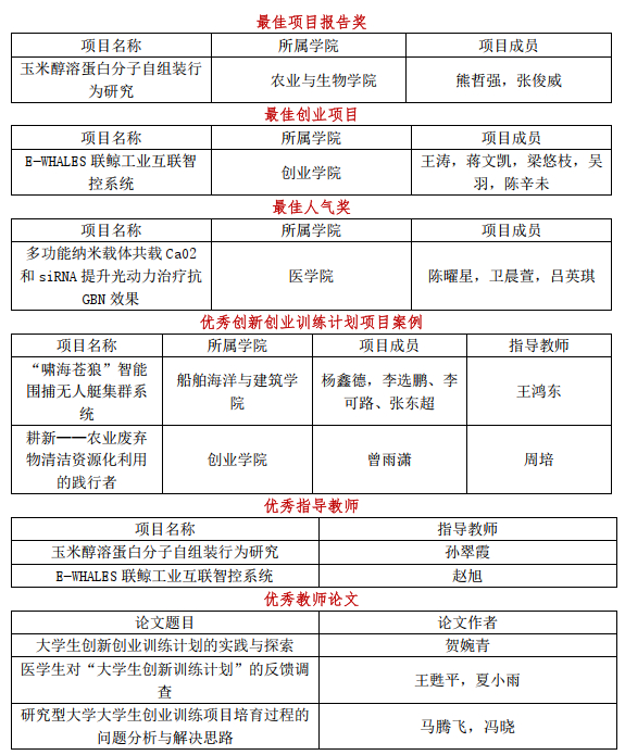 通过前期评审、师生投票、项目路演、专家点评等环节,上海交通大学在此次成果展上获得最佳项目报告奖1项、最佳创业项目1项、最佳人气奖1项、优秀创新创业训练计划项目案例2项、优秀教师论文3篇。