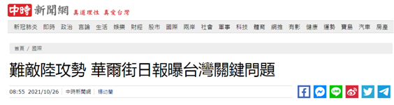 岛内多家媒体都对《华尔街日报》的这篇文章进行了引述报道,台湾“联合新闻网”今天(25日)在引述这篇文章内容时提到,不管是民进党当局还是美国军方和政府官员均称,“台湾岛内的军事力量夹杂许多内部问题,其中很多源自多年来的稳定与经济繁荣,但如今这正在侵蚀台湾阻止大陆(采取军事行动)的能力”。