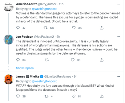 在这样一个舆情下,10月25日,当负责审理此案的巡回法官施罗德表示,里滕豪斯的代理律师可以将被枪击的3人称作“暴徒”、“抢劫者”、“纵火犯”后,立刻引发了美国各界的激烈争论。