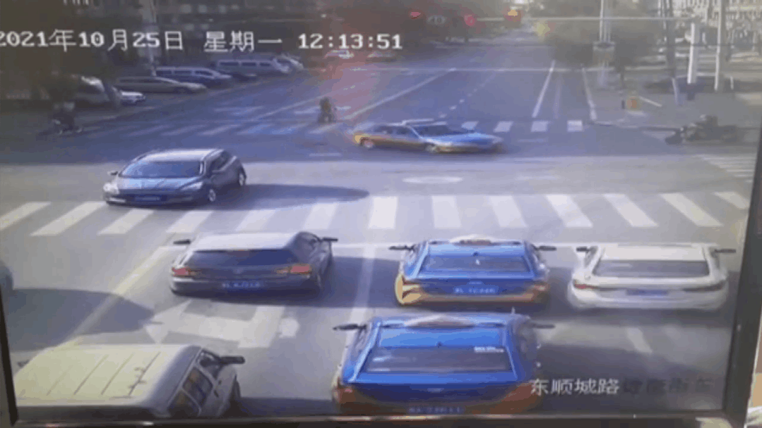 白色轿车先是撞了旁边等灯的出租车,又撞了一辆正在转弯的出租车,连旁边车道等红灯的摩托车也被撞到人行道上,摩托车驾驶员“飞”了出去。这一套操作可真是“笔走龙蛇”。吓得正在过马路的两名行人撒腿就跑,还好白色轿车最终在车道中间停了下来。