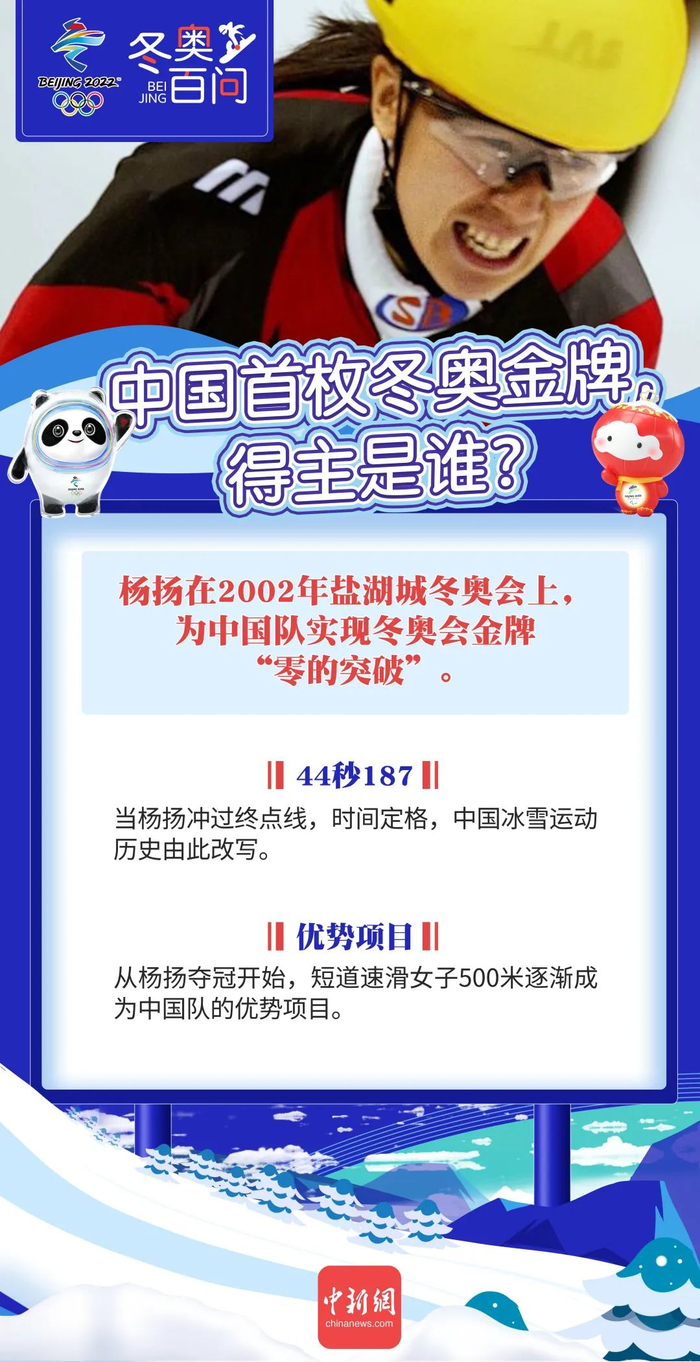 杨扬以44秒187的成绩问鼎冠军,实现了中国冬奥历史上金牌“零的突破”。她的队友王春露摘得一枚宝贵的铜牌。