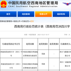 10月21日,中国民用航空西南地区管理局发布了两份行政处罚决定书