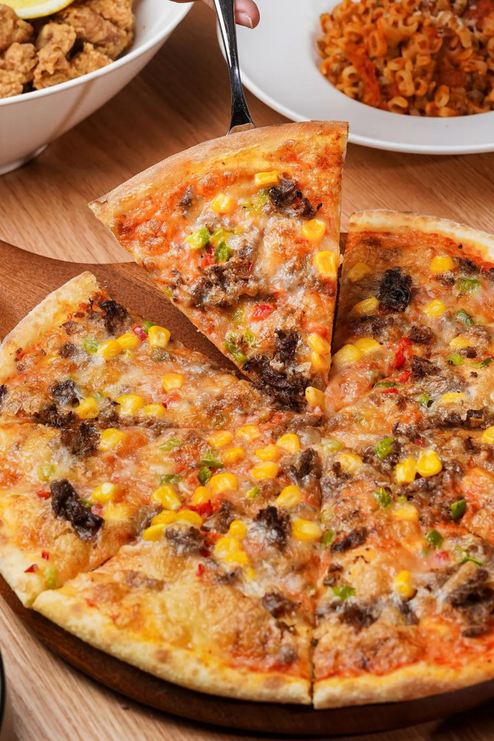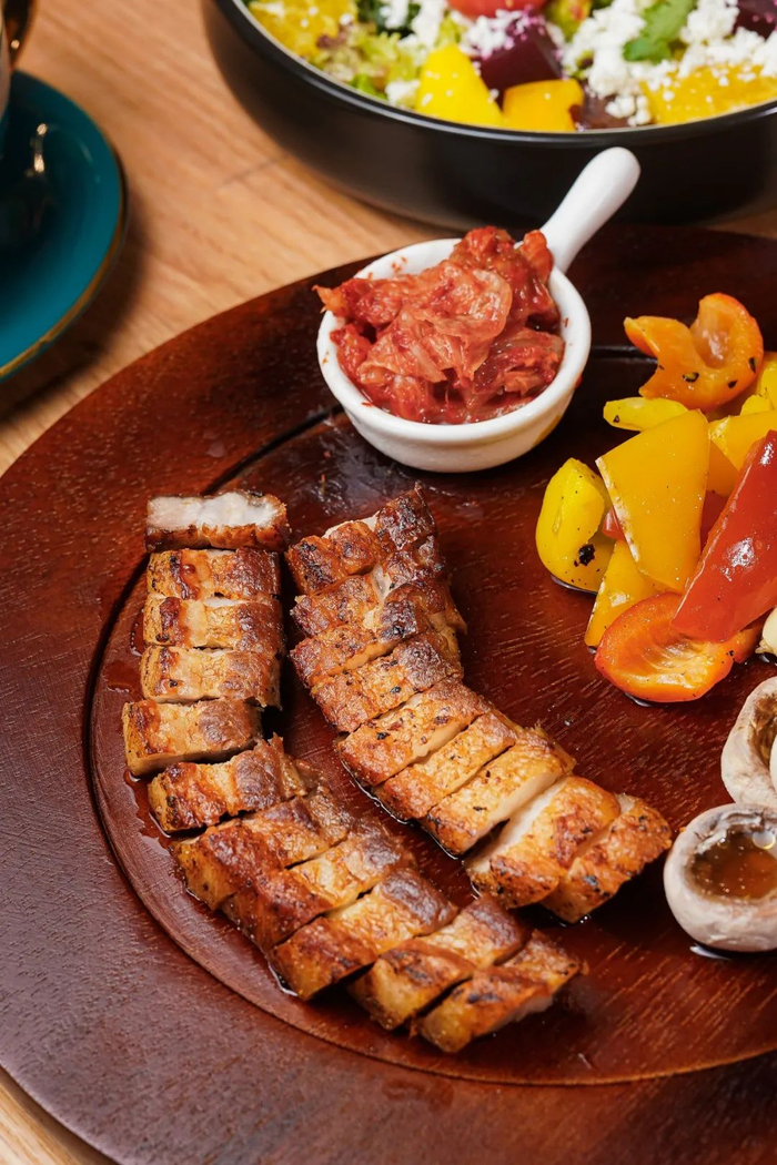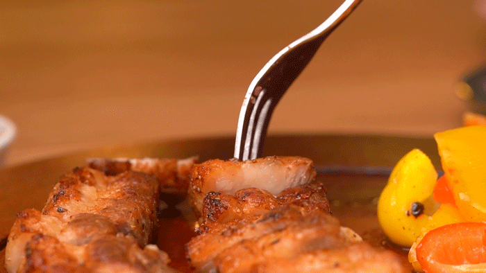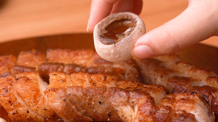 口蘑里的鲜汤汁淋在脆皮五花肉上,一口下去满口肉香四溢;五花肉是提前腌制好的,加上旁面料理好的彩椒,吃上一整盘也不会腻。