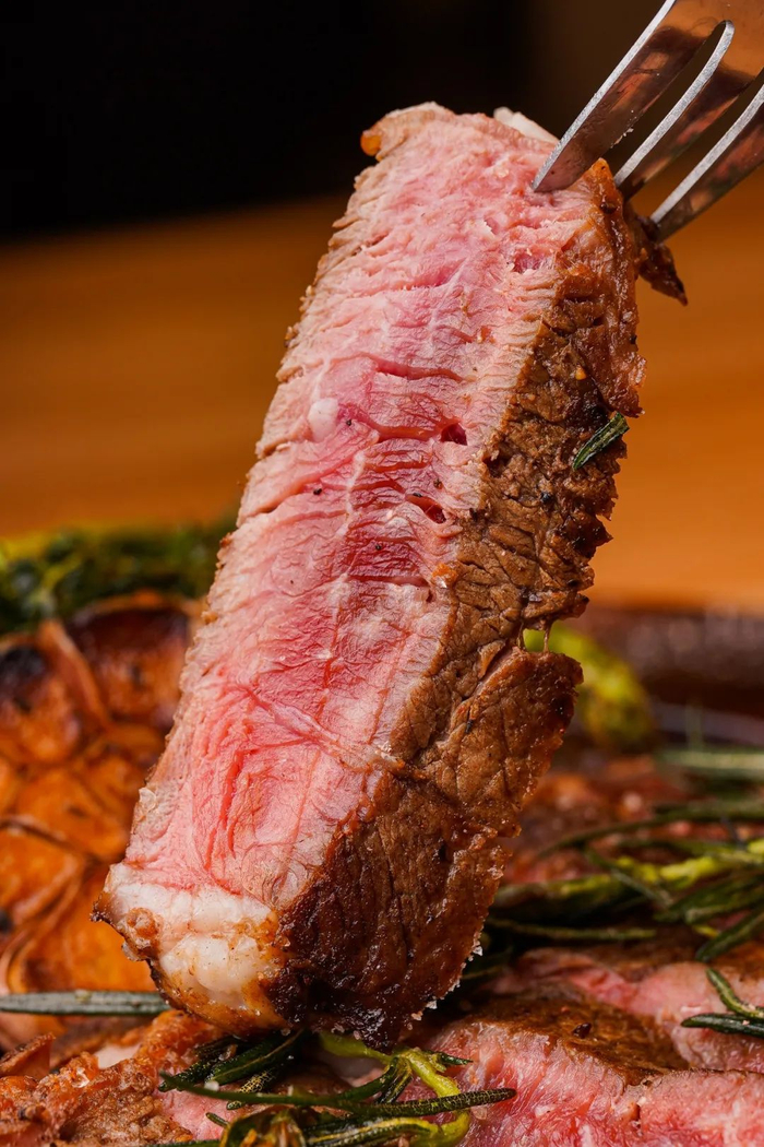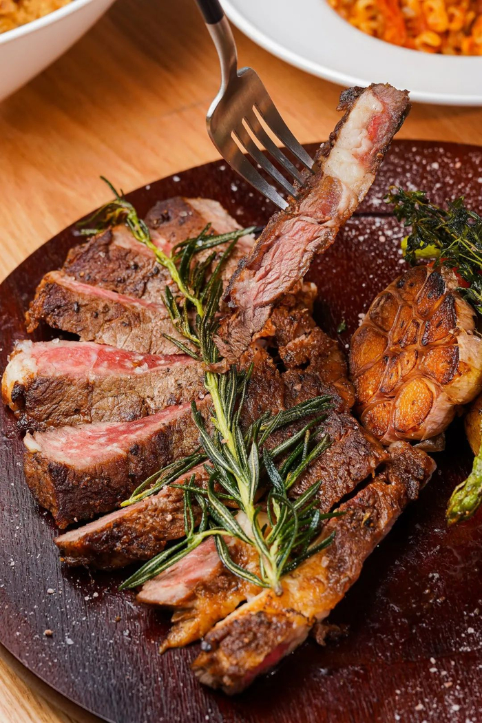 选用谷饲200天的上等澳洲牛眼肉,小火煎至6分熟;微微透红的肉质是最佳程度,再配上樱桃番茄和芦笋点缀,主厨自信地说道:"保证你吃一次就会爱上。"