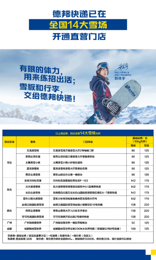 公开资料显示,目前除了太舞雪场,德邦快递已在全国14家知名雪场开设寄递服务网点,不断完善雪具寄递网络版图,全面响应冬奥会“3亿人上冰雪”号召,助力中国冰雪运动腾飞。