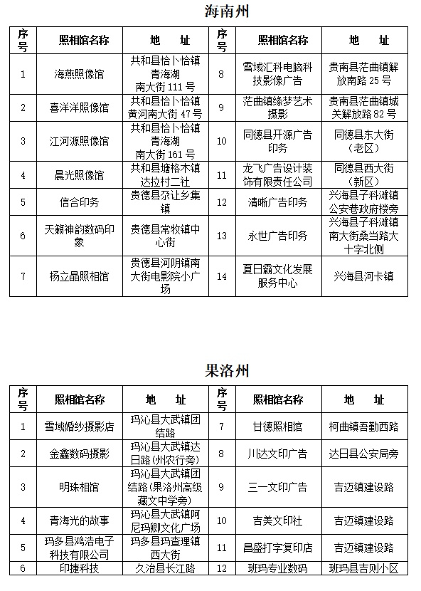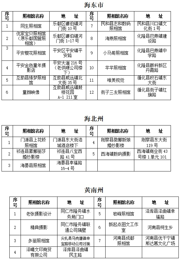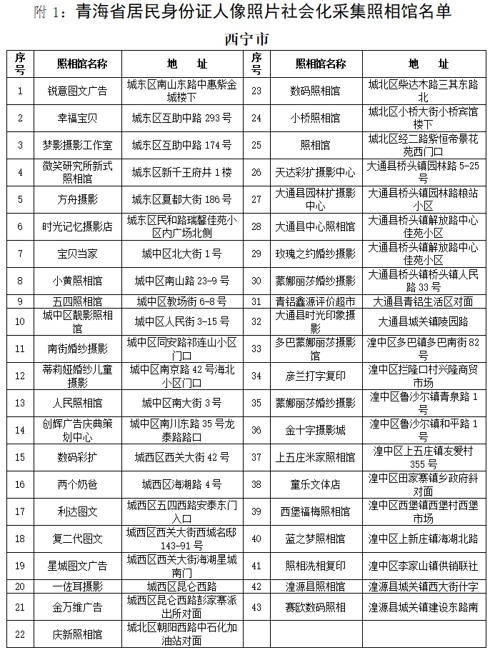附1:青海省居民身份证人像照片社会化采集照相馆名单