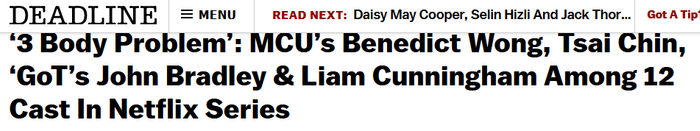 据DEADLINE当地时间29日报道,Netflix网飞公布了剧版《三体》的首批演员阵容,但暂未公开演员所对应出演的角色。