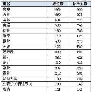 从全省情况看,本次招录人数南京排第一,提供686个职位,招录人数为850人,一举夺冠;其次为苏州市,提供690个职位,招录人数为816人;盐城排第三,招775人。