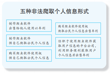 笔者梳理了目前存在的5种利用爬虫技术非法爬取公民个人信息形式,包括制作爬虫软件出售给他人使用以牟利;制作爬虫软件供自己爬取公民个人信息;购买爬虫软件使用权供自己爬取公民个人信息;购买爬虫软件使用权爬取公民个人信息出售牟利;任职于使用爬虫软件获取用户信息的平台公司,利用职务便利获取用户个人信息并出售牟利。