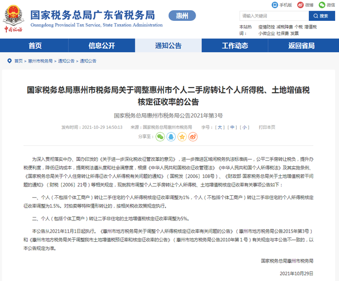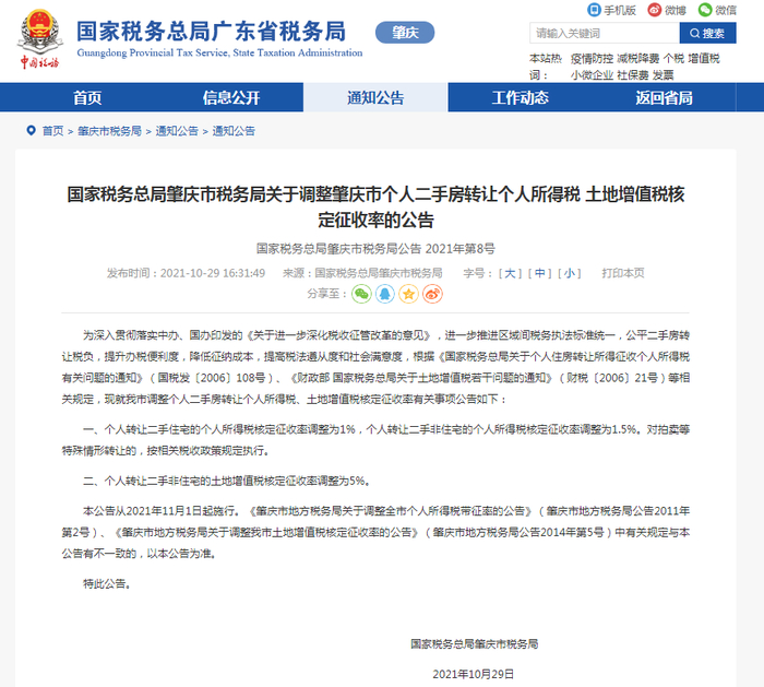 近日,东莞市税务局、珠海市税务局、肇庆市税务局、江门市税务局、惠州市税务局、揭阳市税务局分别发布公告称:11月1日起个人转让二手住宅的个人所得税核定征收率调整为1%,个人转让二手非住宅的个人所得税核定征收率调整为1.5%。
