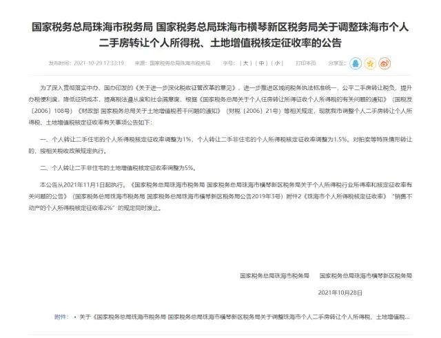 珠海将调整个人二手房转让个人所得税、土地增值税核定征收率,其中个人转让二手住宅的个人所得税核定征收率调整为1%,个人转让二手非住宅的个人所得税核定征收率调整为1.5%;