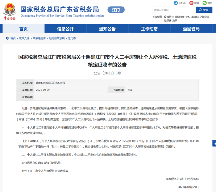 10月29日,国家税务总局江门市税务局发布《国家税务总局江门市税务局关于明确江门市个人二手房转让个人所得税、土地增值税核定征收率的公告》,自今年11月1日起执行。