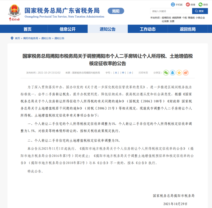 10月29日,国家税务总局揭阳市税务局发布关于调整揭阳市个人二手房转让个人所得税、土地增值税核定征收率的公告。