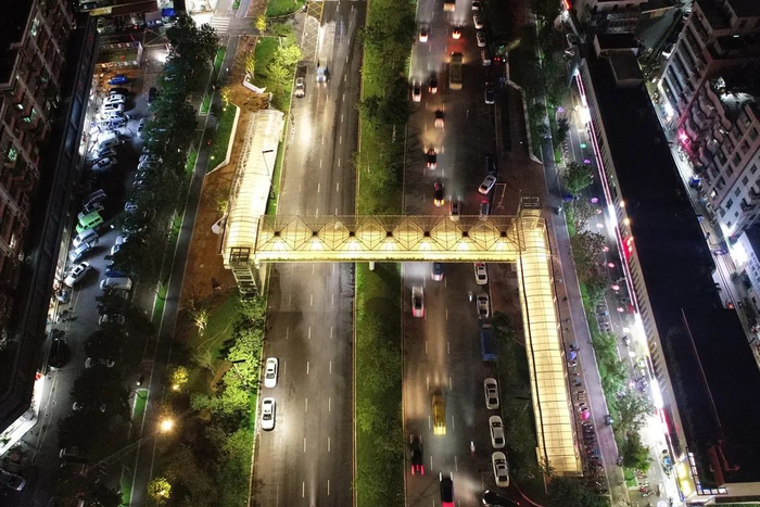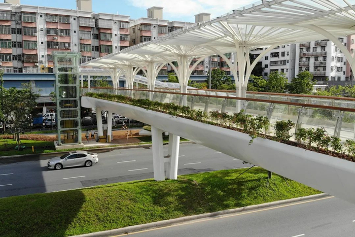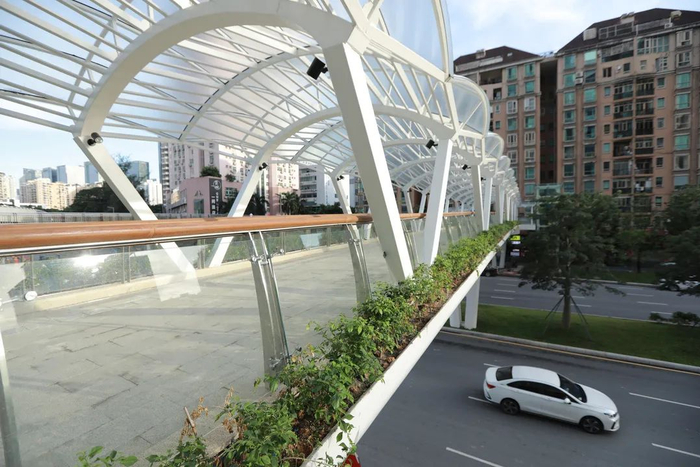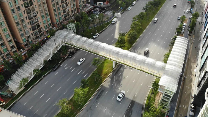 天桥的雨棚采用钢结构和铝合金檩条打造出桅杆的造型,耐力板黏贴出绿荫效果。
